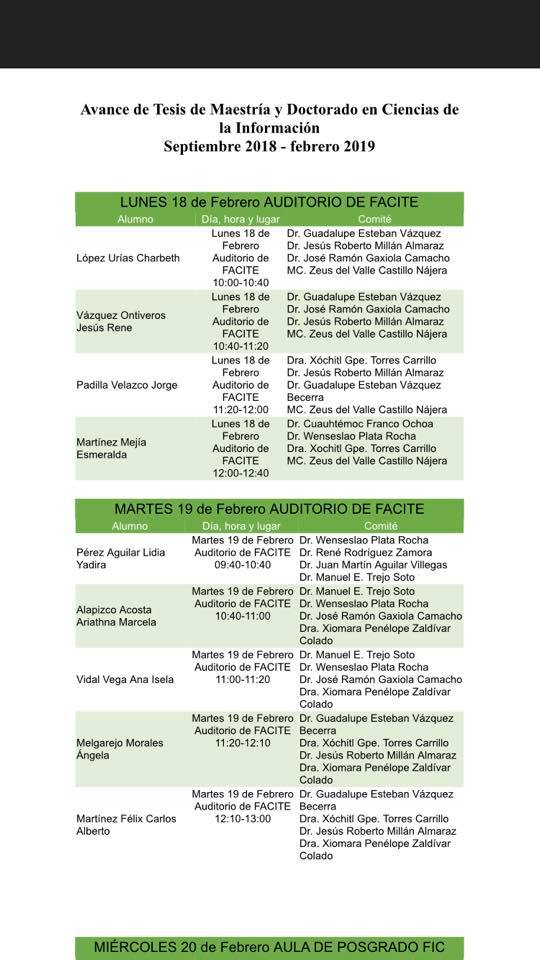 El Posgrado en Ciencias de la Información invita a toda la comunidad académica a estar al tanto de la programación del Seminario de Avances de Tesis que se desarrollará en los próximos días, como parte de las actividades de seguimiento y evaluación del trabajo de investigación de los estudiantes.