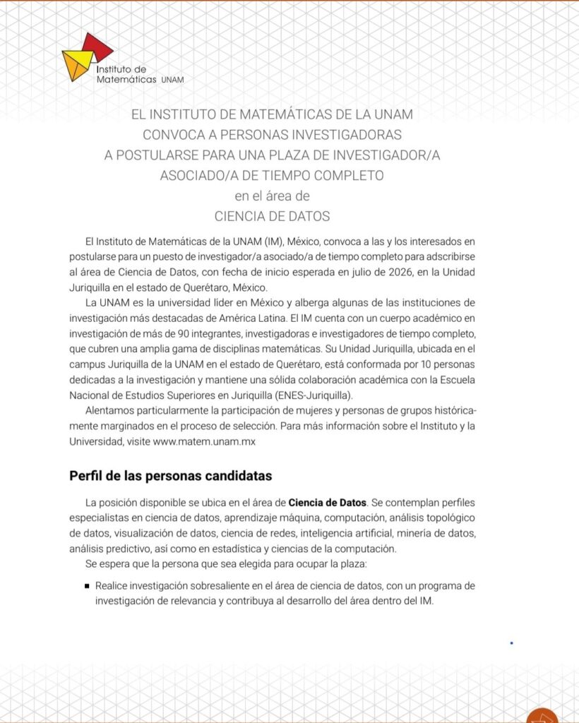 A partir del 5 de diciembre de 2025 se encuentra abierta una convocatoria para ocupar una plaza de Investigadora o Investigador Asociado “C” en el área de ciencia de datos